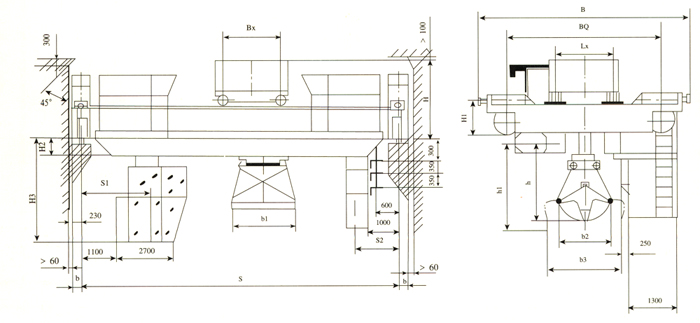 本機由箱形橋架、大車運行機構、小車、抓斗、電氣設備五部分組成,全部機構均在操縱室內操縱。