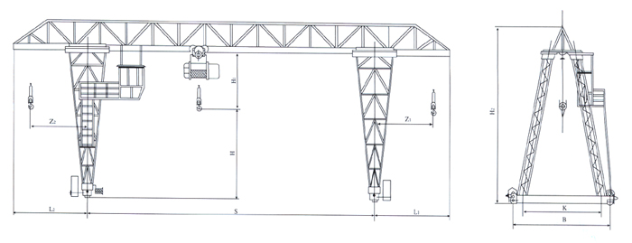 本機(jī)是與CD1或MD1型電動(dòng)葫蘆配套使用,適用干露天作業(yè)的固定跨間,本機(jī)禁止吊運(yùn)熔化金屬及易燃、易爆物品,根據(jù)用戶要求還可制成單端外伸懸臂式或無懸臂式結(jié)構(gòu)。
