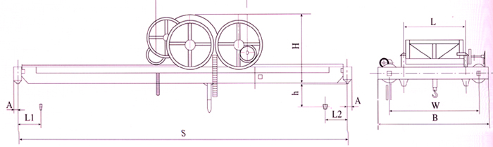 手動(dòng)雙梁起重機(jī)有橋架,大車傳動(dòng)機(jī)構(gòu),卷揚(yáng)小車等主要部分組成。大車小車行車及起重均以手動(dòng)鏈條驅(qū)動(dòng)。